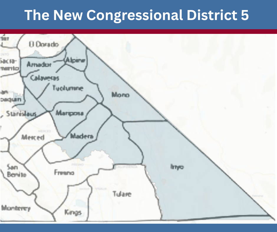 California's 5th Congressional District is a resilient and diverse region, where rich agricultural lands meet the rugged Sierra Nevada and expand on to the Nevada border, fostering a unique blend of communities.